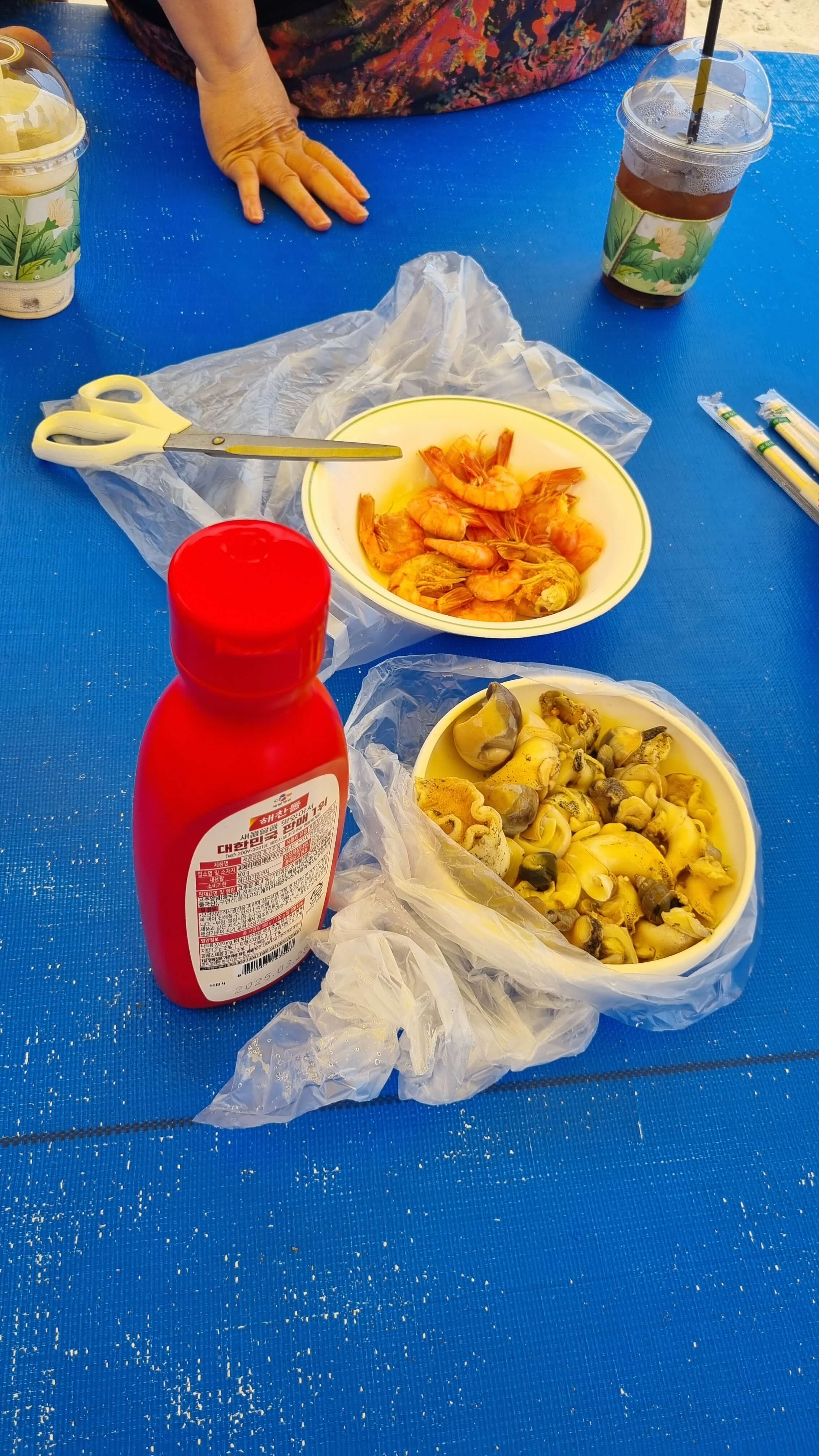 아침에 근처 시장에서 구입한 소라와 새우를 직접 삶아 해변에 가져와 간단한 피크닉 식사를 즐겼습니다. 시원한 바닷바람과 함께 먹는 해산물은 정말 꿀맛이었어요. 조용한 해변과 잘 어울리는 자연 속 식사였습니다.