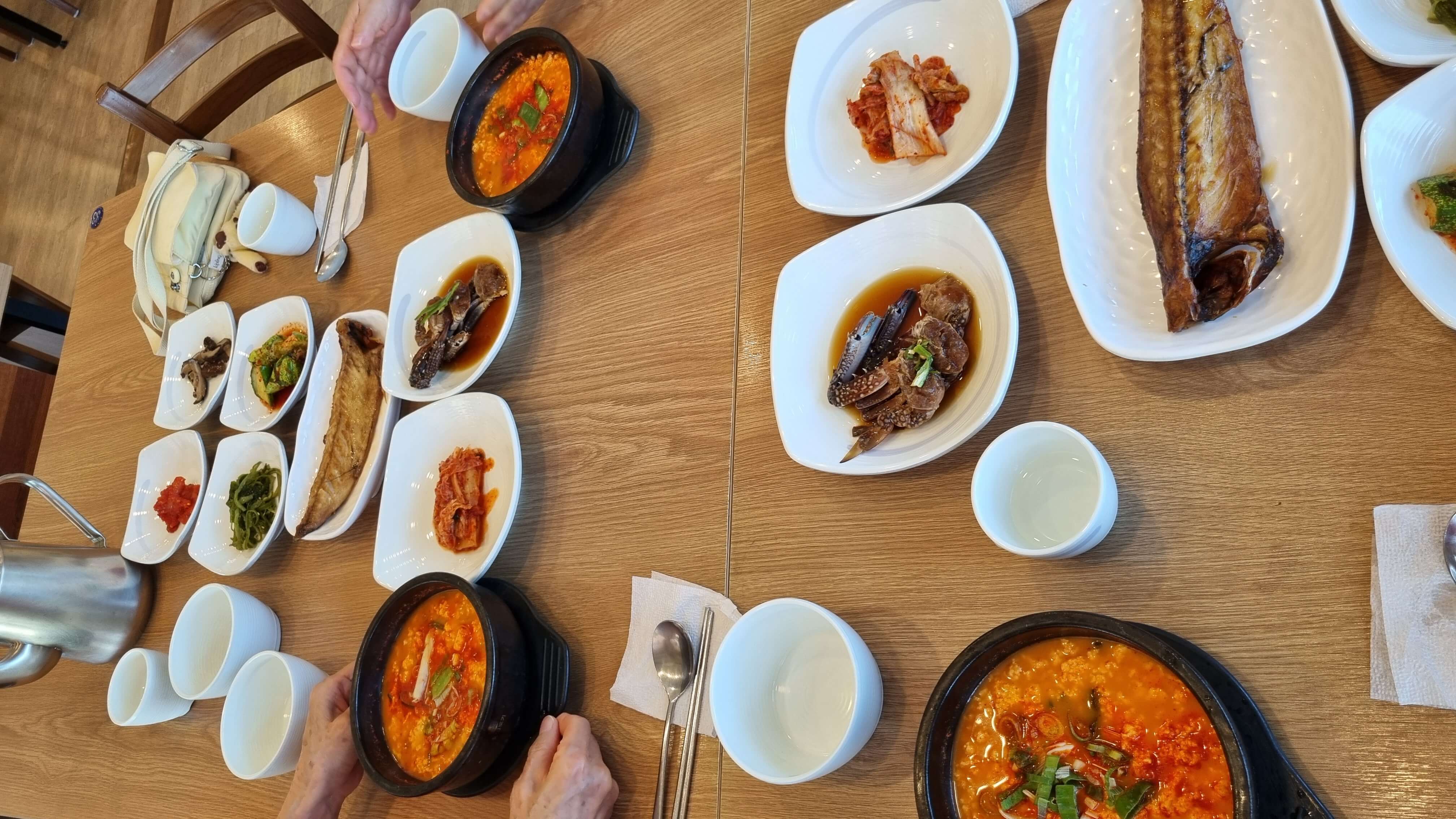 '콩서리' 식당에서 메뉴를 주문하면 기본적으로 고등어 생선구이부터 간장게장 그리고 김치와 오이와 같은 반찬들이 제공됩니다. 특히 고등어 구이가 맛있었고 나머지 다른 반찬들도 정갈했어요.