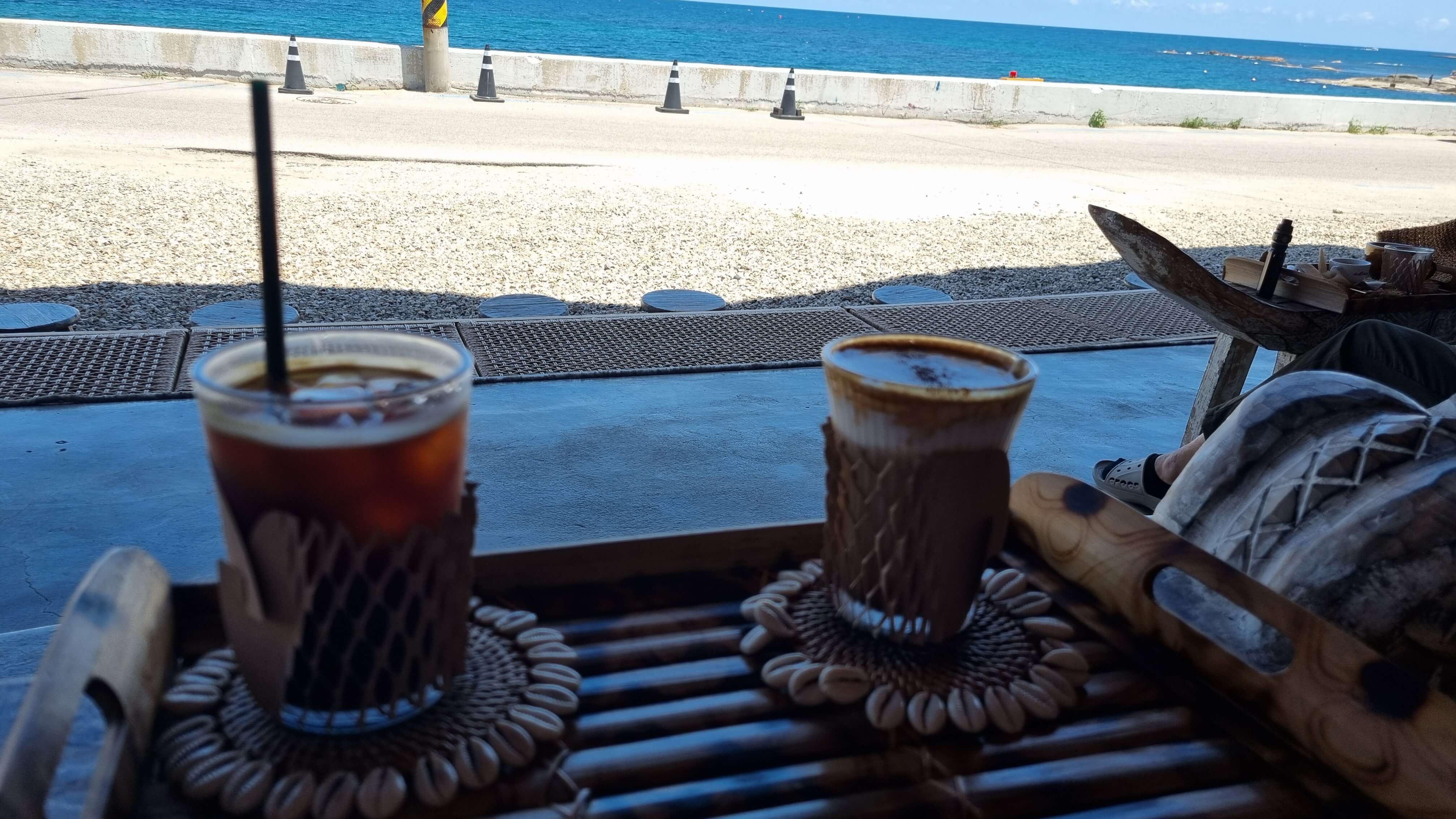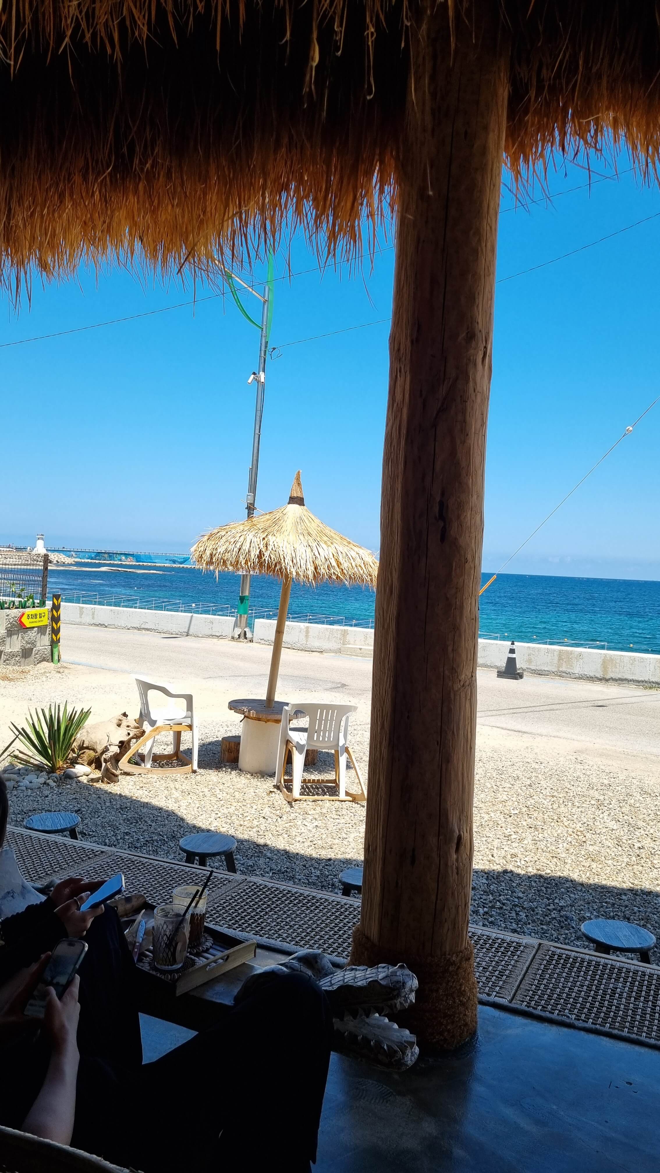 카페 바로 앞에는 바다사이에 도로가 하나 있지만, 오른쪽으로 조금 더 들어가면 도로의 끝이라 차량들이 많이 다니지 않아서 좋아요. 다만 여름 극성수기가 된다면 카페 앞에도 주차차량들이 많이 생기지 않을까 싶습니다. 저는 7월 초에 방문했어요~
