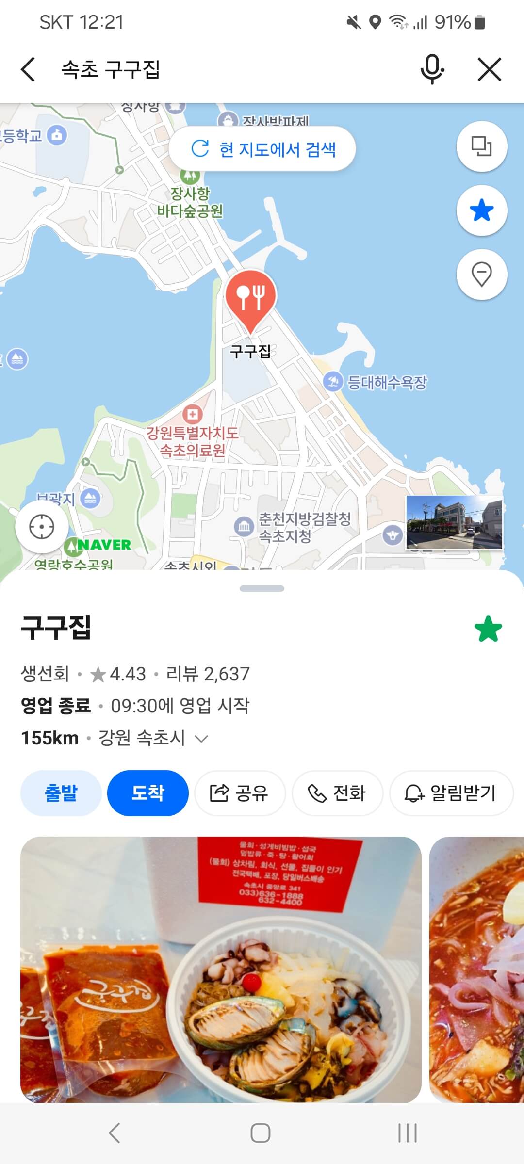 속초 '구구집'은 현지인 친구가 추천해주신 횟집으로, 싱싱한 생선회들도 많있지만 특히 물회로 현지인들 사이에서 유명하다고 합니다. 저희는 전복죽과 모듬물회 2개를 포장했는데, 신선한 전복이 듬뿍 들어간 전복죽은 숙소에서 간편하게 먹기 좋았고, 회 포장도 정갈하게 해주셔서 이동 중에도 흐트러짐 없이 가져올 수 있었습니다.
