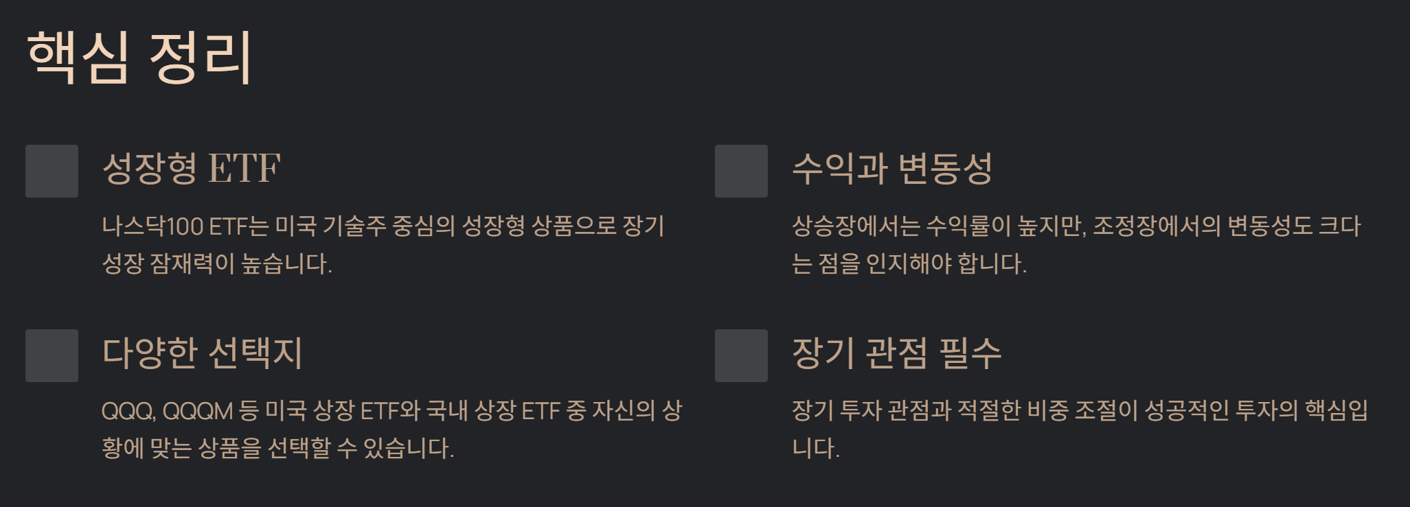 - QQQ, QQQM 등이 대표적이며 투자 방식은 다양하다.