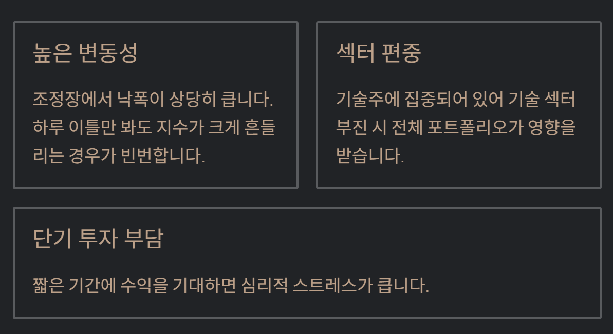 반대로 조정장에서는 낙폭이 꽤 큽니다. 하루 이틀만 봐도 지수가 크게 흔들리는 경우가 있어, 단기 수익을 기대하면 부담이 될 수 있었습니다.