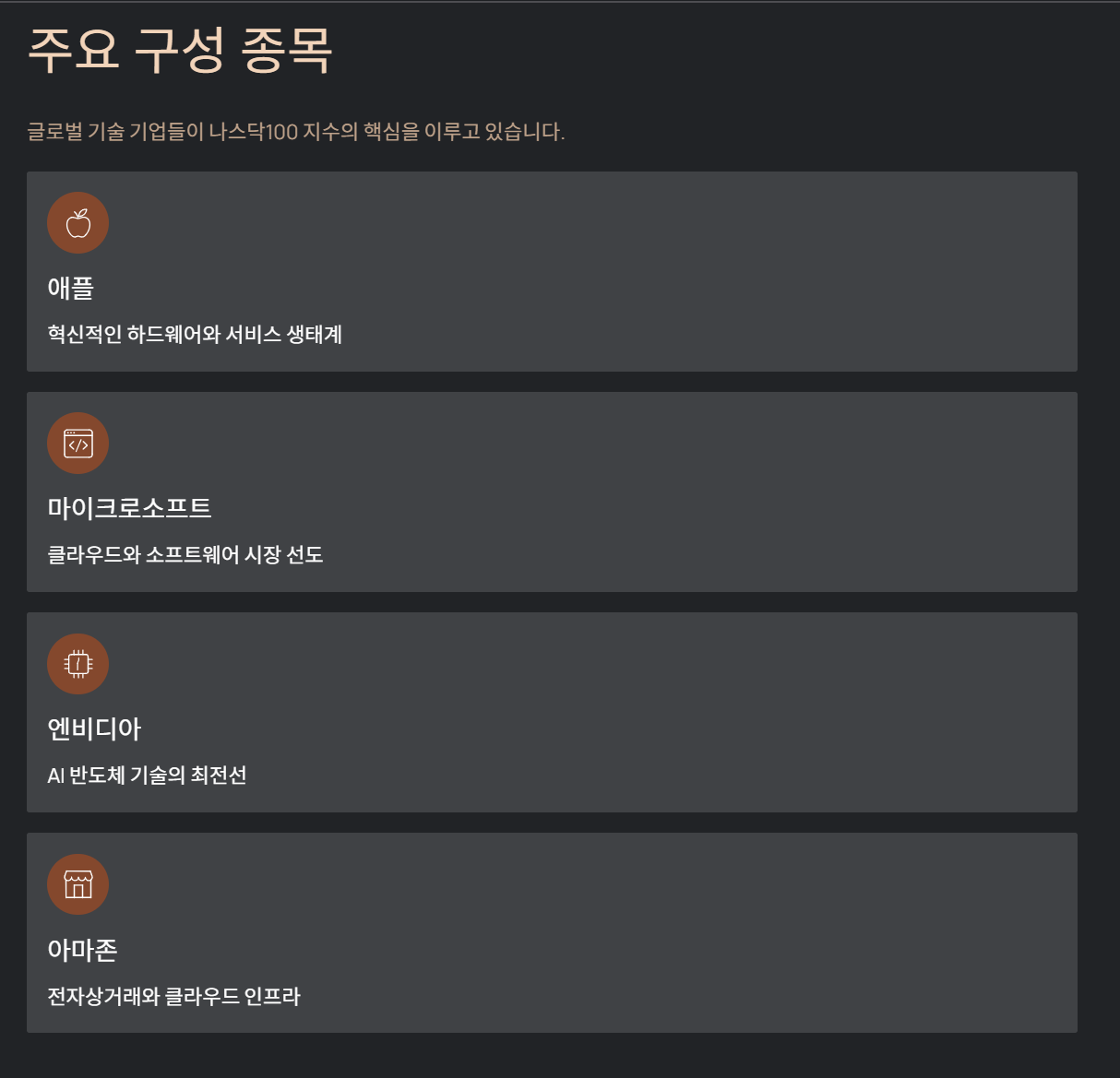 애플, 마이크로소프트, 엔비디아, 아마존처럼 글로벌 기술 기업들이 큰 비중을 차지합니다. 그래서 지수 흐름을 보면 미국 기술 산업의 분위기를 비교적 직접적으로 느낄 수 있었습니다.