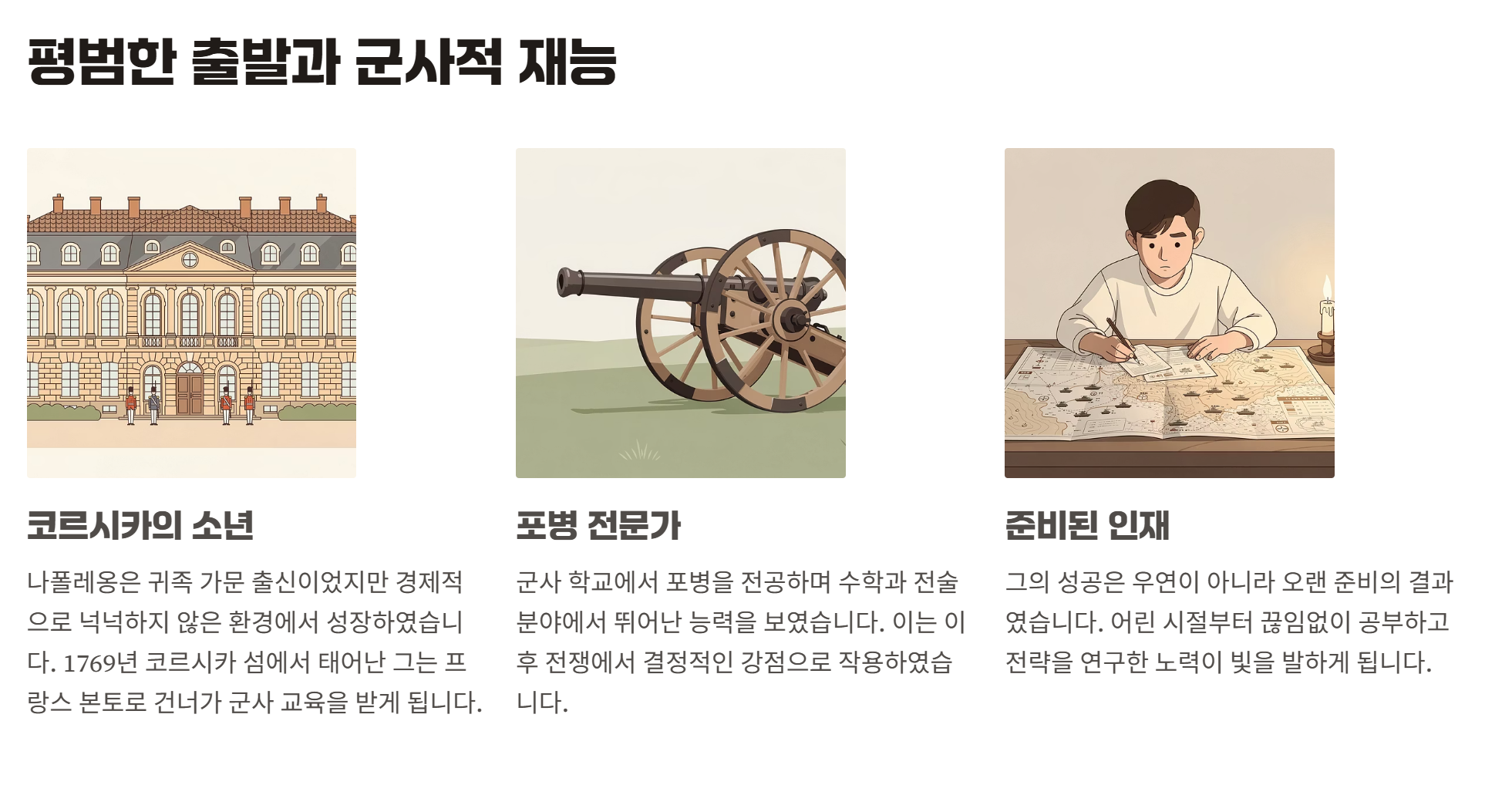 나폴레옹은 귀족 가문 출신이었지만 경제적으로 넉넉하지 않은 환경에서 성장하였습니다. 군사 학교에서 포병을 전공하며 수학과 전술 분야에서 뛰어난 능력을 보였고, 이는 이후 전쟁에서 큰 강점으로 작용하였습니다. 이 시기를 살펴보며 그의 성공은 우연이 아니라 오랜 준비의 결과였다는 점을 확인하게 되었습니다.