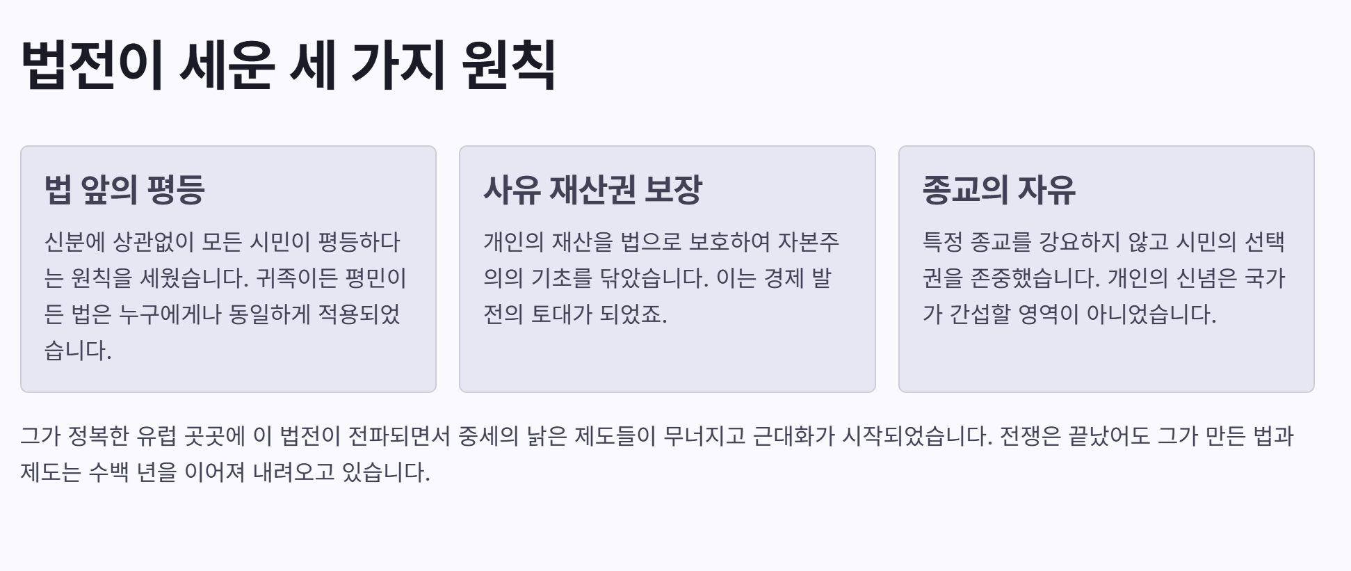 - 법 앞의 평등: 신분에 상관없이 모든 시민이 평등하다는 원칙을 세웠습니다.