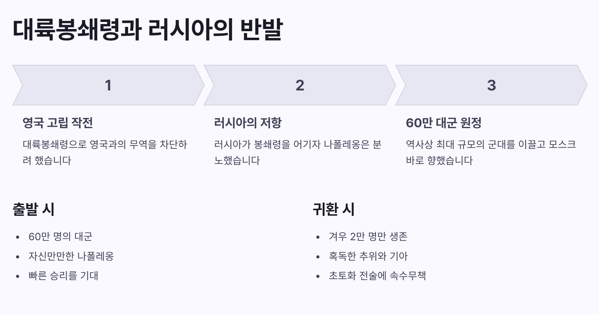 러시아가 이 봉쇄령을 어기자 나폴레옹은 60만 대군을 이끌고 원정을 떠납니다. 하지만 결과는 처참했습니다. 러시아의 혹독한 추위와 모든 것을 태우고 후퇴하는 전략에 무적의 나폴레옹군은 속수무책으로 무너졌습니다.
