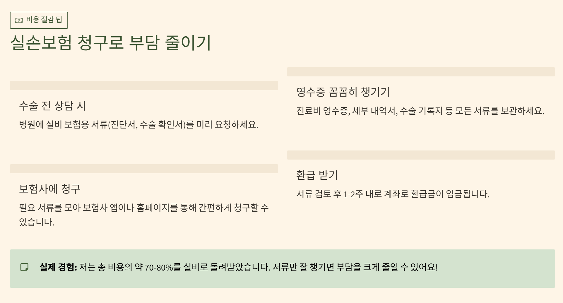 여기서 중요한 점은 본인이 가입한 실손의료보험(실비) 적용이 가능하다는 것입니다. 저 같은 경우에도 서류를 잘 챙겨서 청구했더니 수술비의 상당 부분을 돌려받을 수 있었어요. 수술 전 상담 시 병원에 실비 보험용 서류(진단서, 수술 확인서 등)를 미리 요청해 두는 것이 좋습니다.