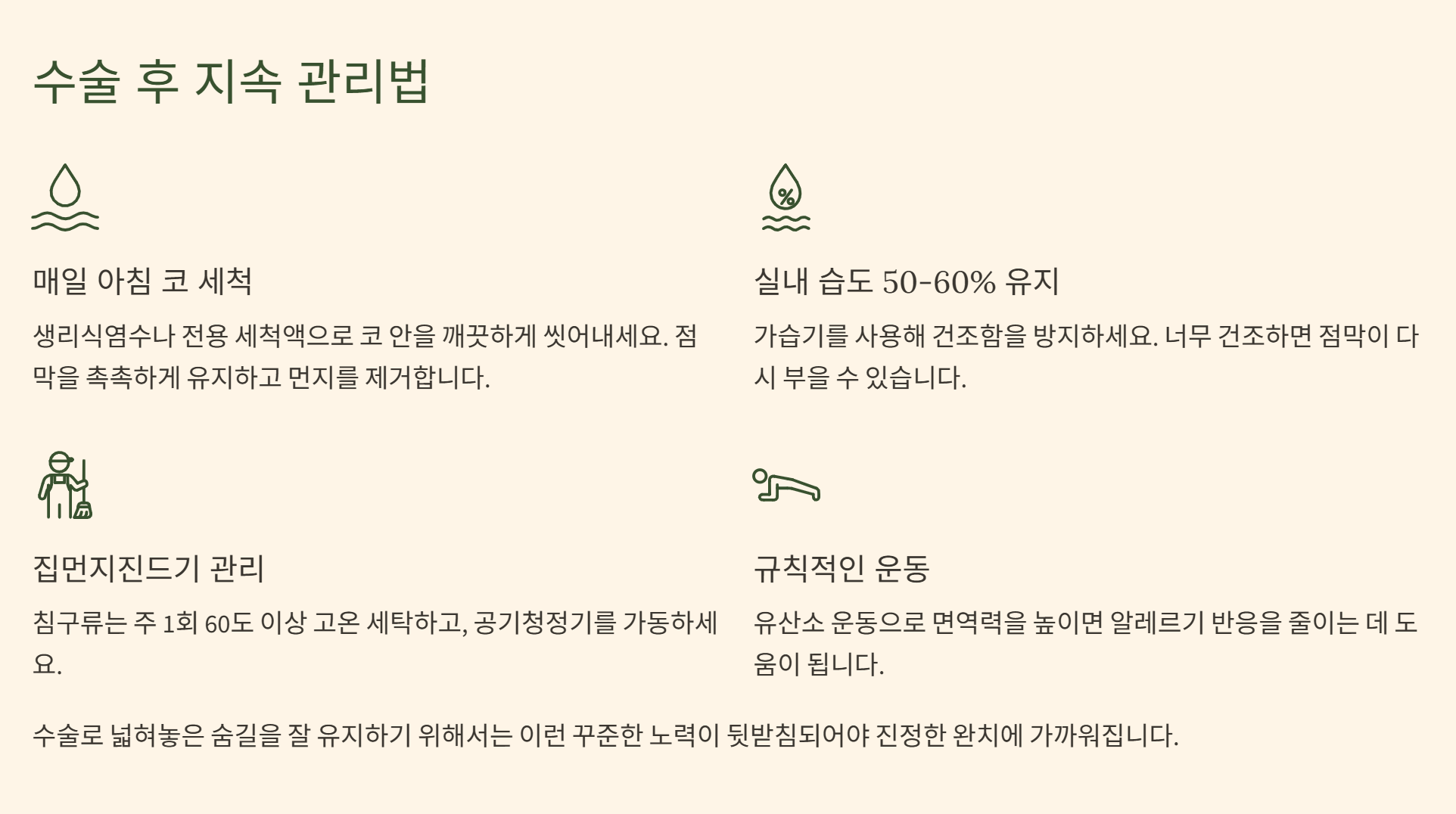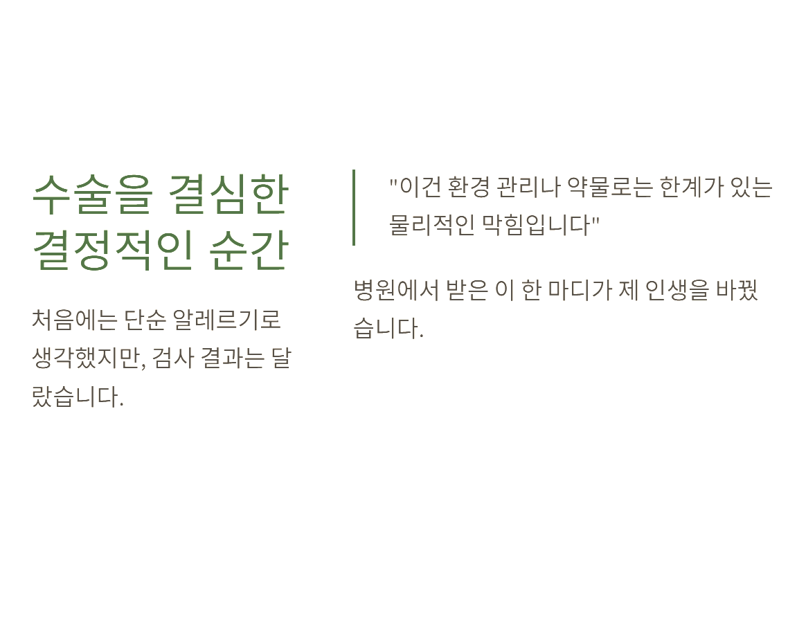 - 지속 관리: 수술은 시작일 뿐, 코 세척과 환경 관리를 병행해야 재발을 막을 수 있습니다.