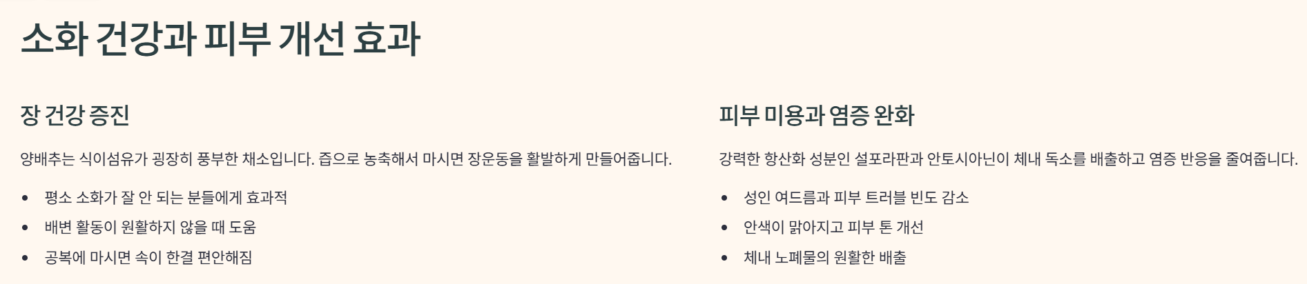 양배추는 칼로리가 낮으면서도 포만감이 높습니다. 즙으로 마시면 식사 전 허기를 달래주는 효과가 있어서 과식을 방지하게 되죠. 또한, 간의 해독 기능을 돕는 성분들이 포함되어 있어 피로 해소에도 긍정적인 영향을 준다는 점이 인상적이었습니다.