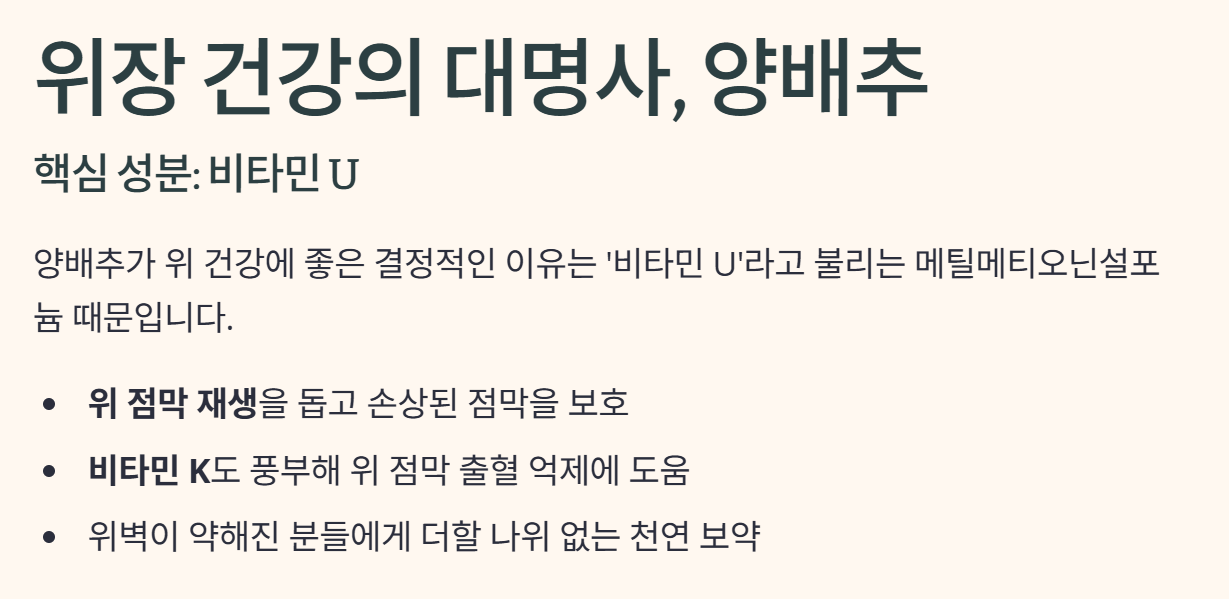 - 위 점막 보호: 비타민 U와 K가 위벽 재생과 출혈 억제에 도움을 줍니다.