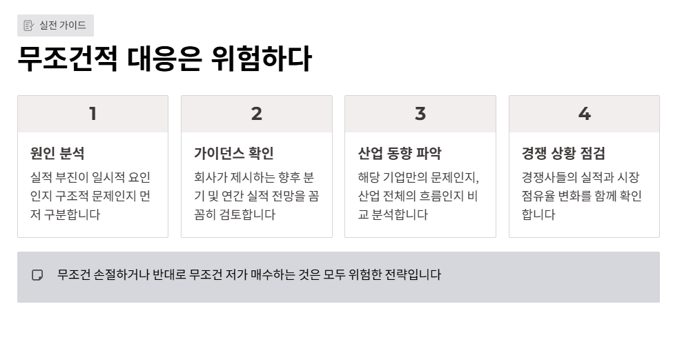 어닝 쇼크가 나왔을 때 무조건 손절하거나 반대로 무조건 저가 매수하는 것은 위험할 수 있습니다. 먼저 원인이 일시적인지 구조적인지 구분하는 과정이 필요합니다.