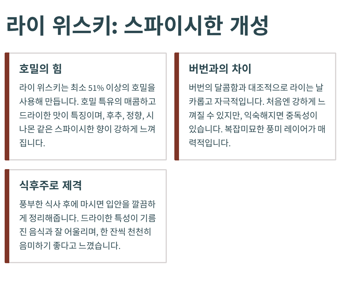 스카치는 향과 깊이, 버번은 달콤함, 라이는 스파이시함이 특징이다.