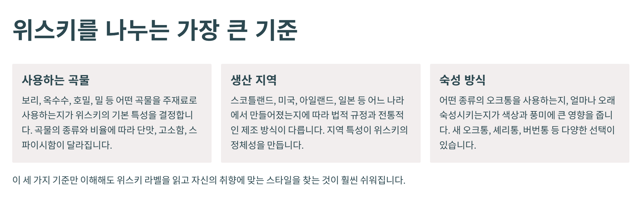 위스키는 기본적으로 곡물을 발효·증류해 만든 술이다. 어떤 곡물을 쓰는지, 어느 나라에서 만들었는지가 종류를 나누는 핵심 기준이 된다. 이 두 가지만 알아도 라벨이 훨씬 읽기 쉬워졌다.