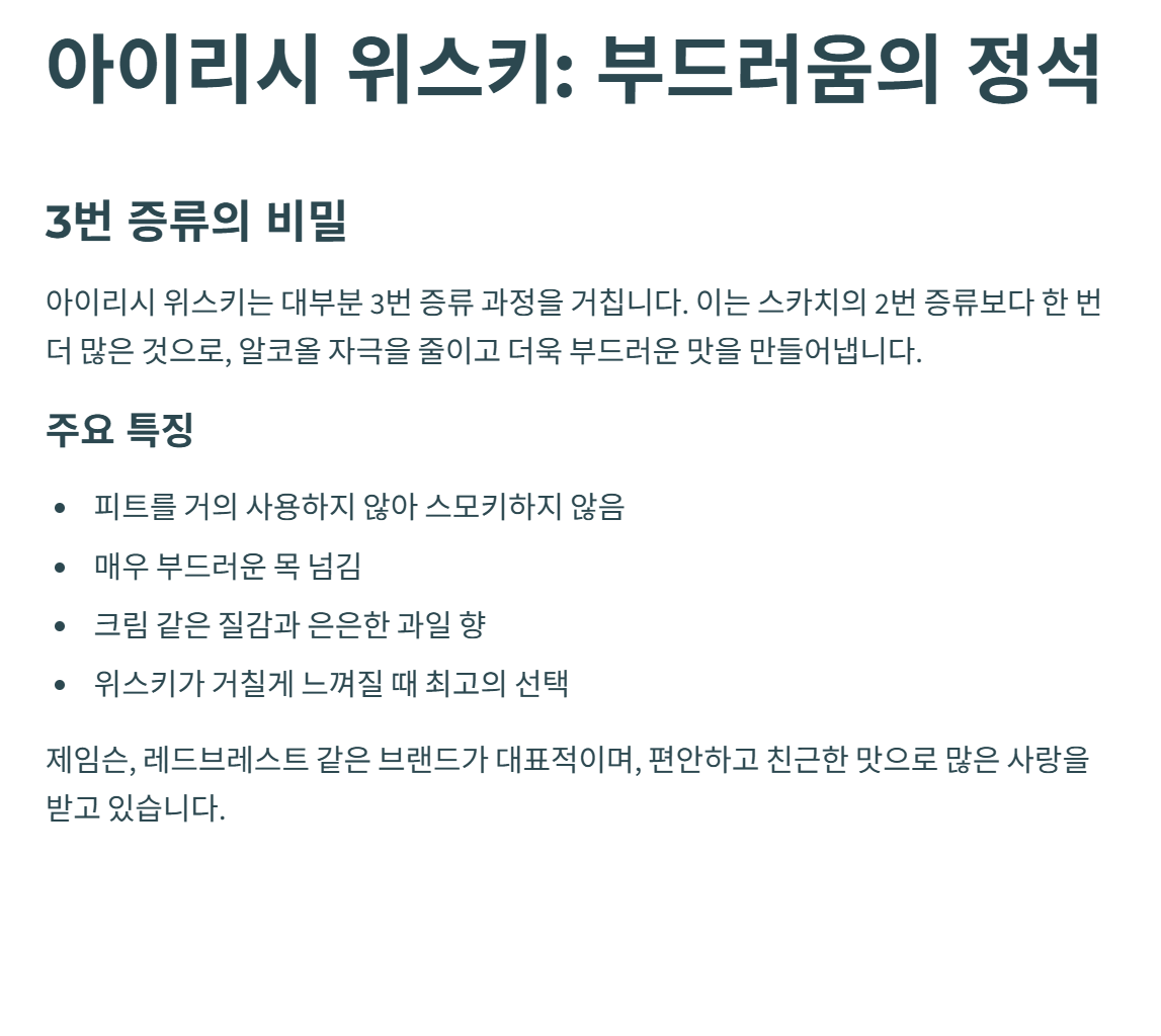대체로 3번 증류하는 경우가 많아 알코올 자극이 적다. 위스키가 거칠게 느껴질 때 아이리시 위스키를 마시면 확실히 편안했다.