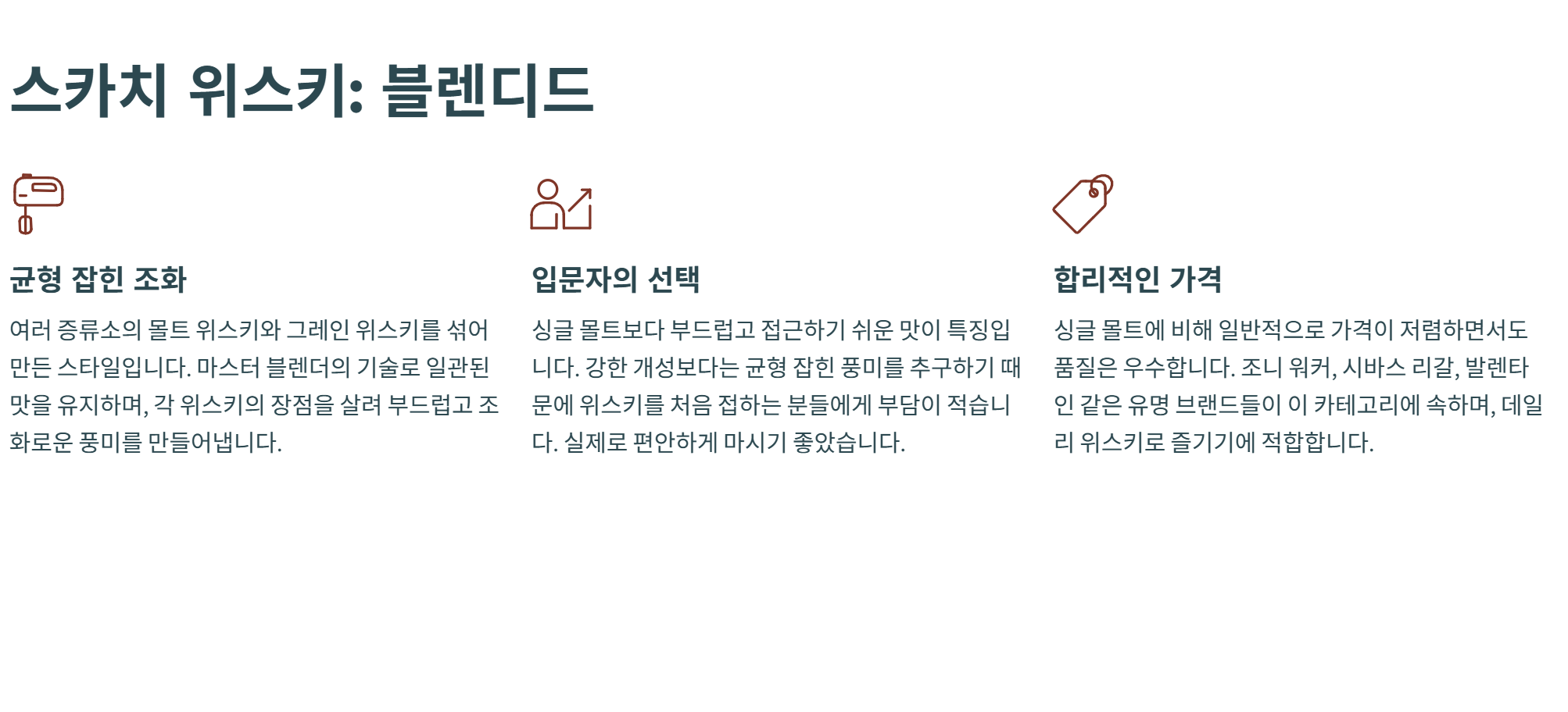 위스키는 단순히 독한 술이 아니라, 종류를 이해할수록 즐길 포인트가 늘어나는 술이다. 처음엔 어렵게 느껴졌지만, 몇 가지 기준만 알고 나니 선택이 훨씬 쉬워졌다. 다음에 위스키를 고를 때는 이름보다 종류부터 떠올리게 될 것이다, 그렇게 자연스럽게 이어지고 있다.