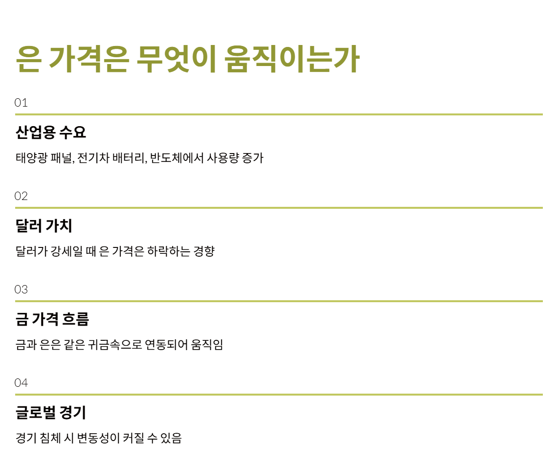은 가격은 단순히 귀금속 수요만으로 움직이지 않습니다. 산업용 수요, 달러 가치, 금 가격 흐름, 글로벌 경기 상황이 복합적으로 작용합니다. 특히 태양광, 전기차, 반도체 산업에서 은 사용량이 늘어난다는 점은 장기적인 관점에서 긍정적으로 보였습니다. 반대로 경기 침체 시에는 가격 변동이 커질 수 있다는 점도 직접 경험하며 체감했습니다.