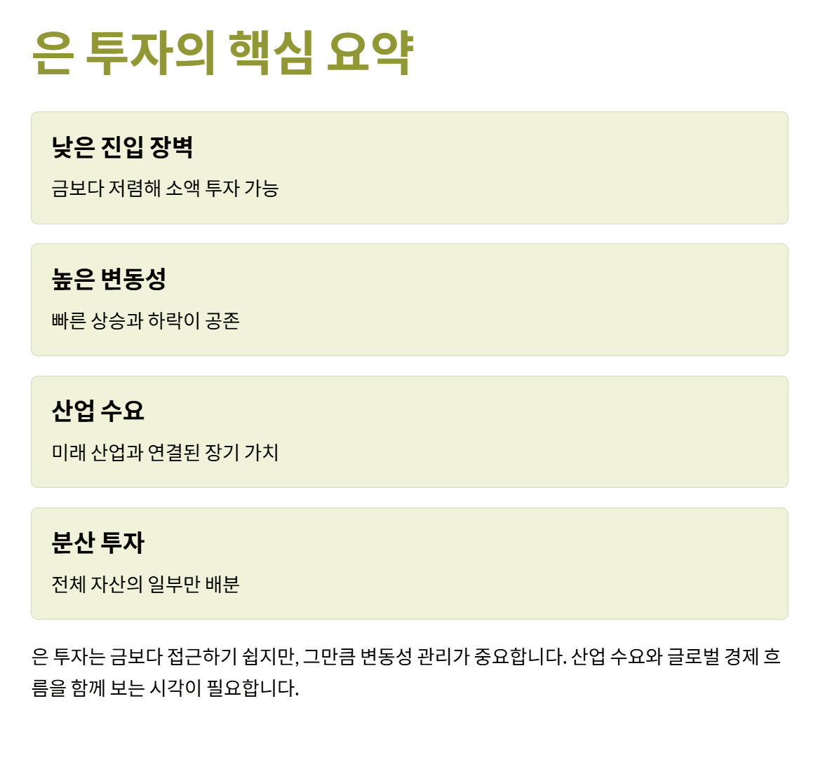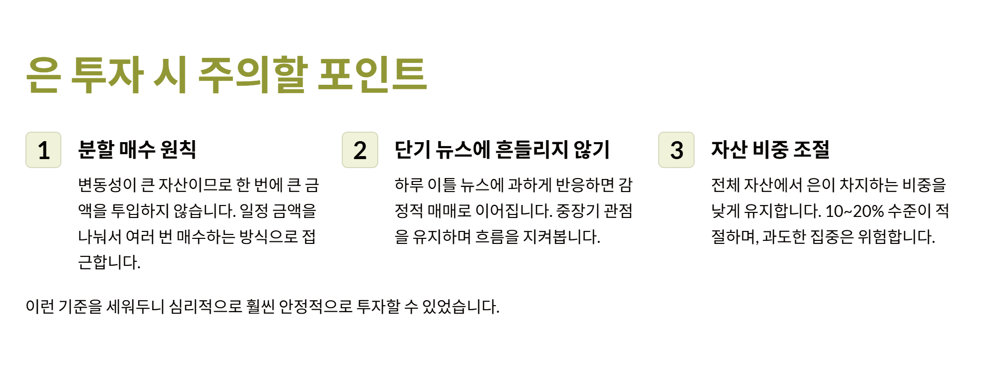 은은 금보다 가격 변동폭이 큽니다. 상승할 때는 빠르지만, 하락할 때도 그만큼 빠르게 움직입니다. 그래서 단기 수익을 노리기보다는 중장기 분산 자산으로 접근하는 것이 마음이 편했습니다.