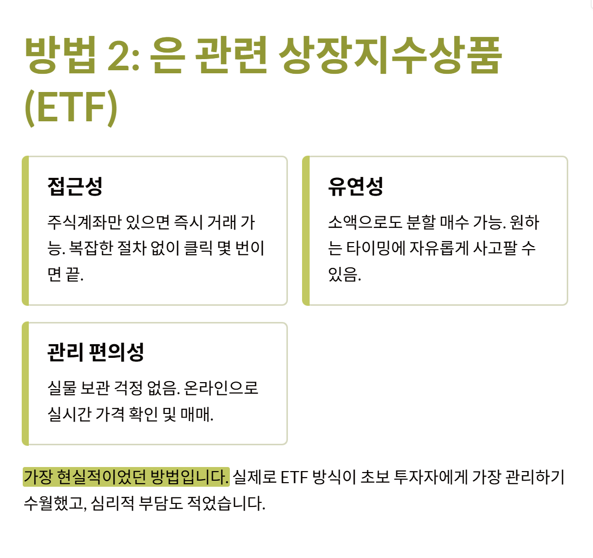 가장 현실적이었던 방법은 은 가격에 연동된 상장지수상품이었습니다. 주식처럼 거래할 수 있어 접근성이 좋았고, 소액으로도 분할 매수가 가능했습니다. 실제로 이 방식이 가장 관리하기 수월했습니다.