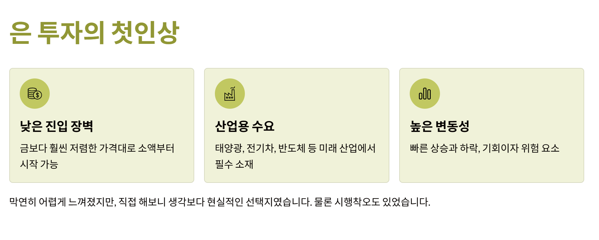은은 금보다 단가가 낮아 소액으로 접근하기 쉬웠고, 산업용 수요가 많다는 점도 매력적으로 느껴졌습니다. 실제로 자료를 찾아보고 차트를 보면서, 장기적으로 분산 투자 자산으로 고려할 만하다고 판단했습니다.