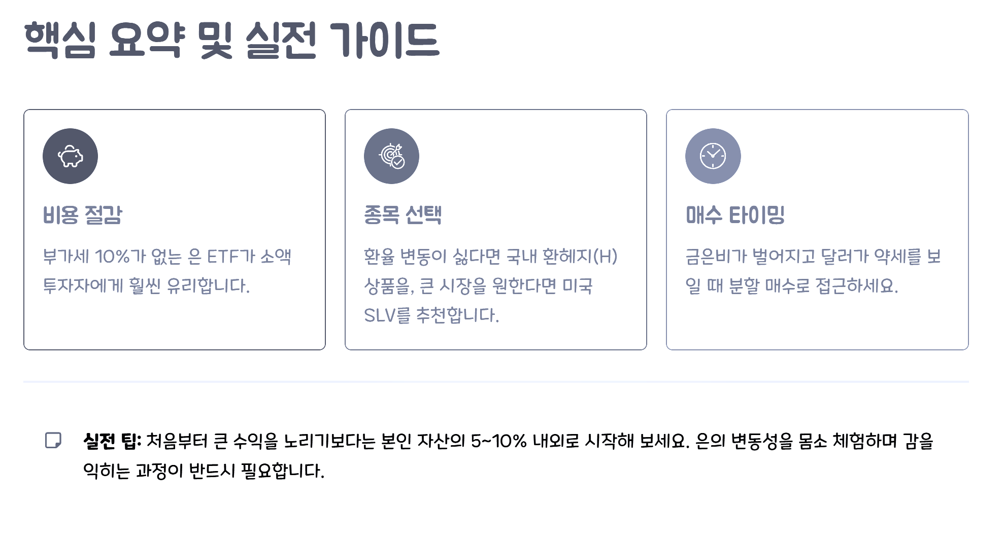 - 비용 절감: 부가세 10%가 없는 은 ETF가 소액 투자자에게는 훨씬 유리합니다.