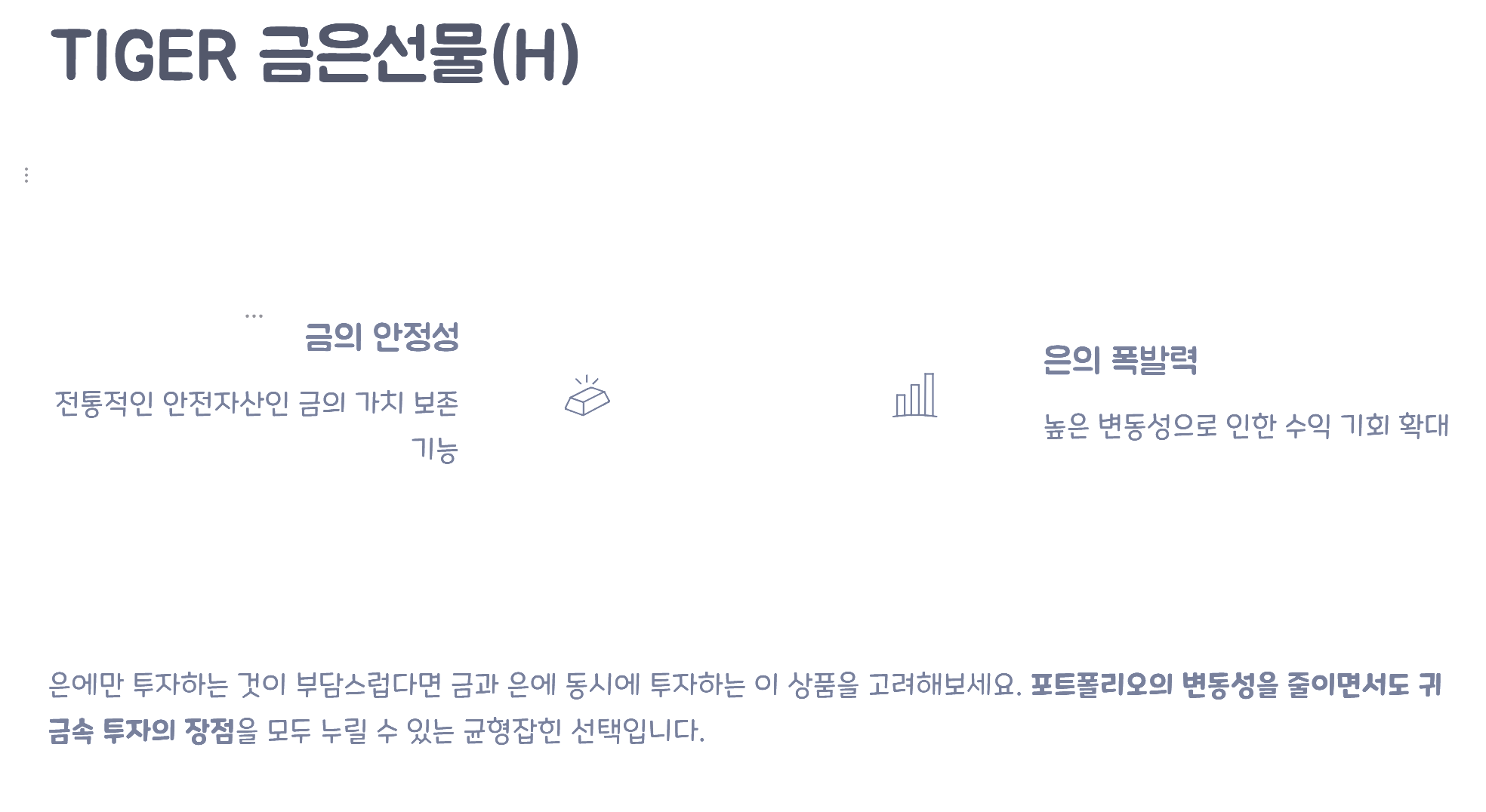 은에만 투자하는 게 조금 불안하다면 금과 은에 동시에 투자하는 이 상품도 대안이 될 수 있습니다. 은의 폭발력과 금의 안정성을 동시에 챙길 수 있는 구조죠. 포트폴리오의 변동성을 줄이고 싶은 분들에게 적합한 선택지라고 봅니다.