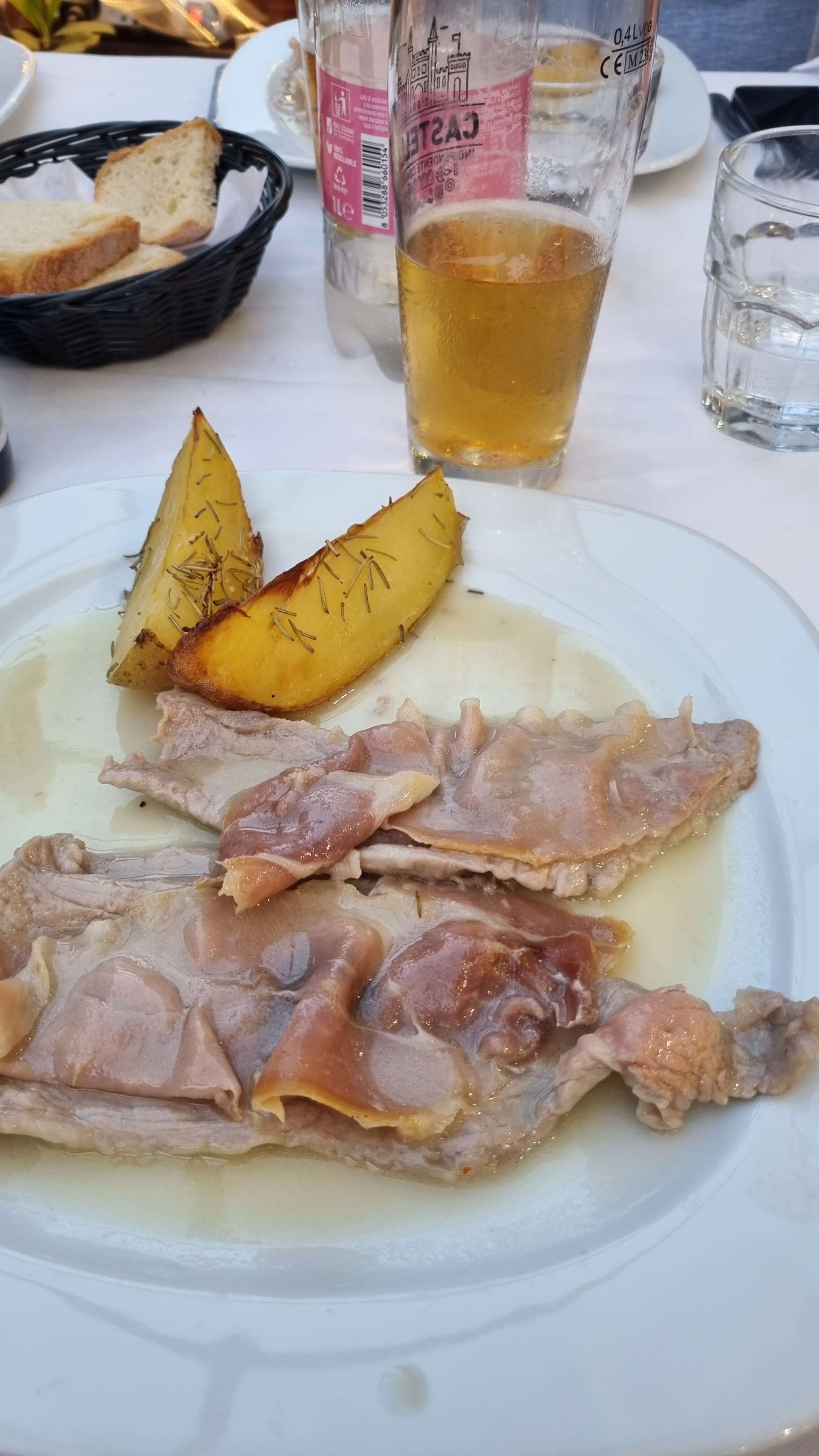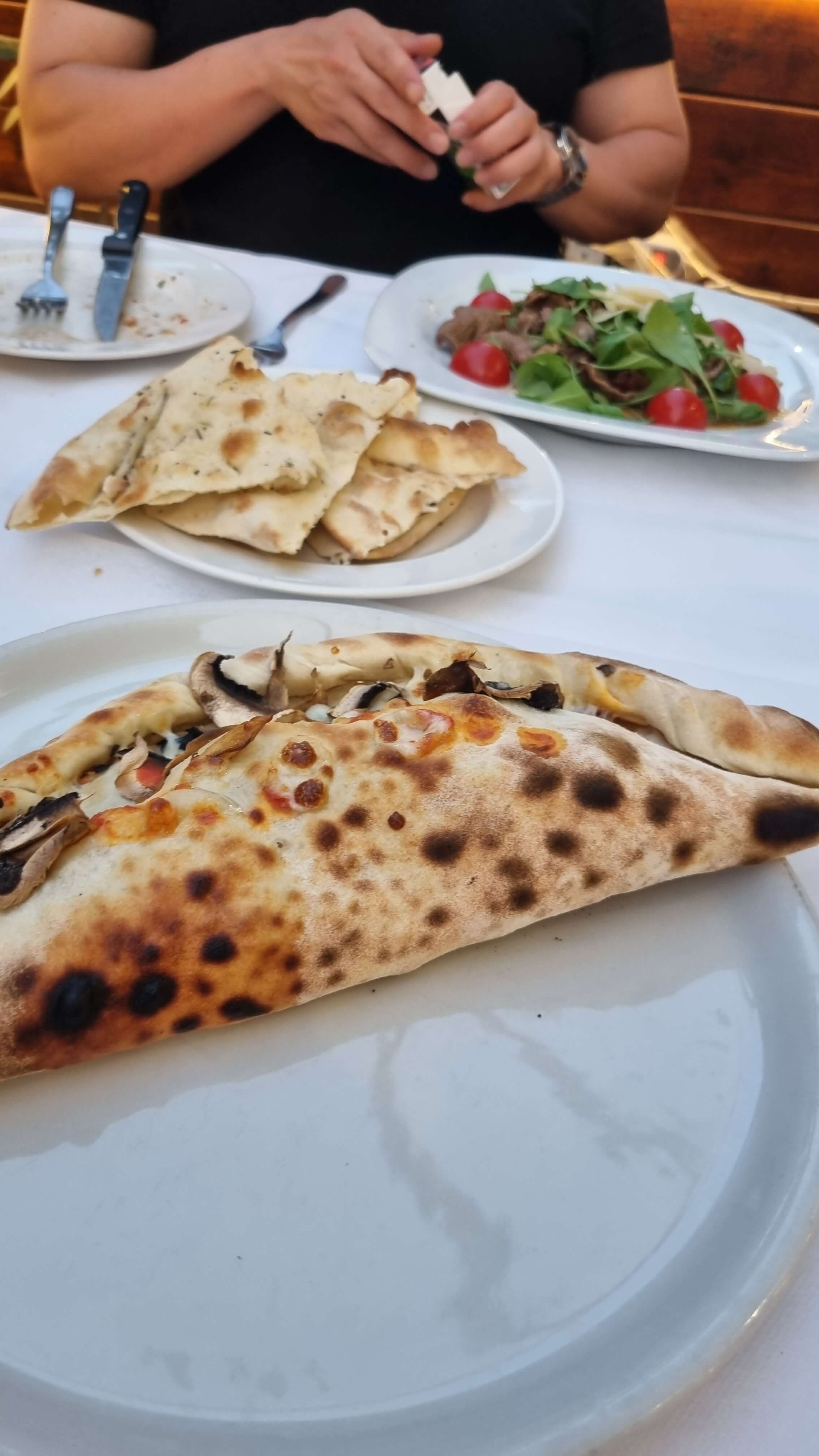 모든 일정을 마치고 숙소로 돌아와, 숙소 바로 앞의 레스토랑에서 저녁을 즐겼습니다. 이탈리아 전통 칼조네와 송아지 고기 요리(Vitello al forno)를 주문했는데, 부드럽고 고소한 맛이 하루의 피로를 잊게 해줬습니다.