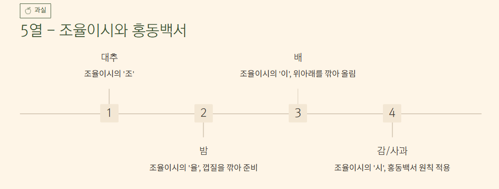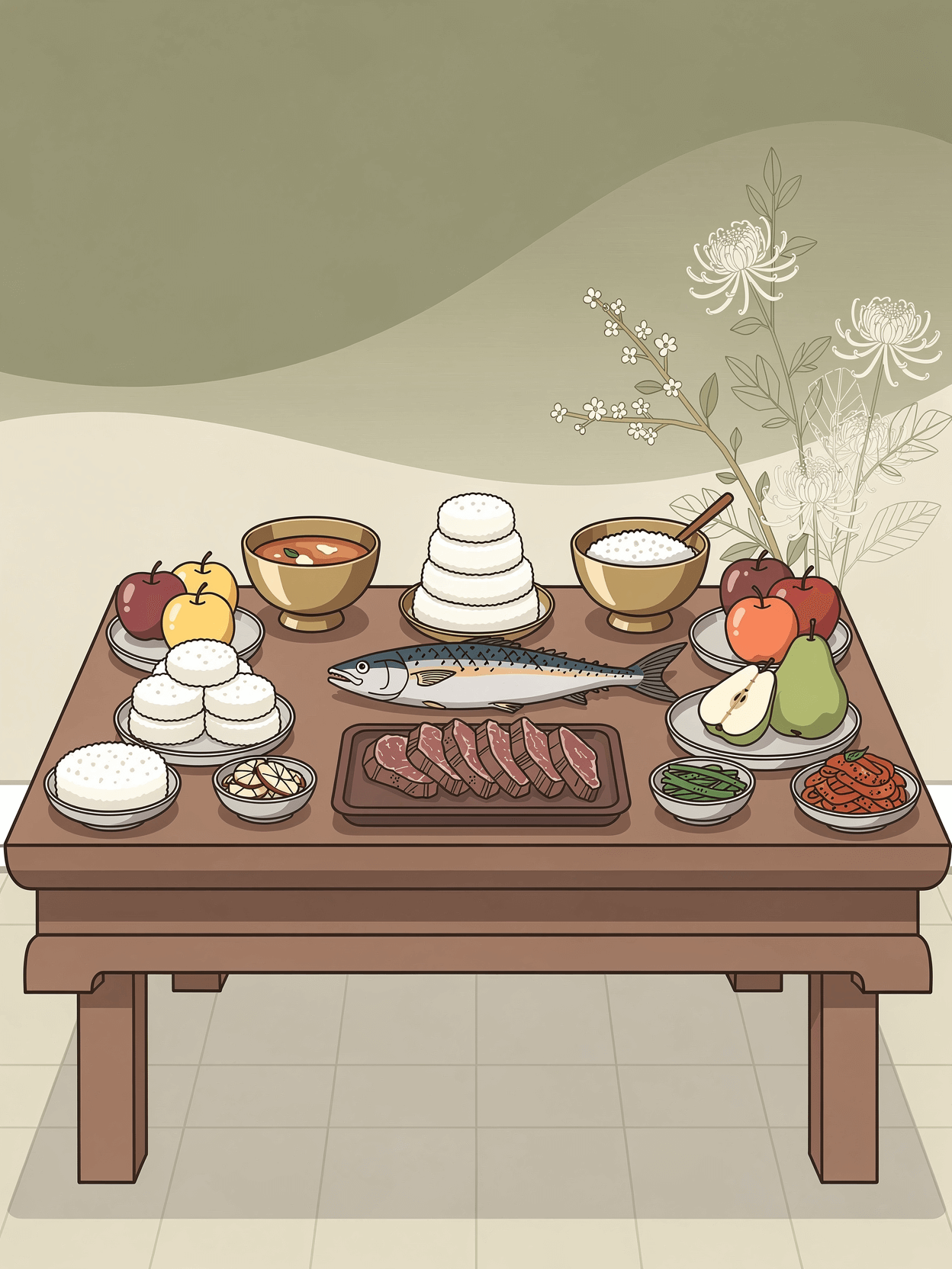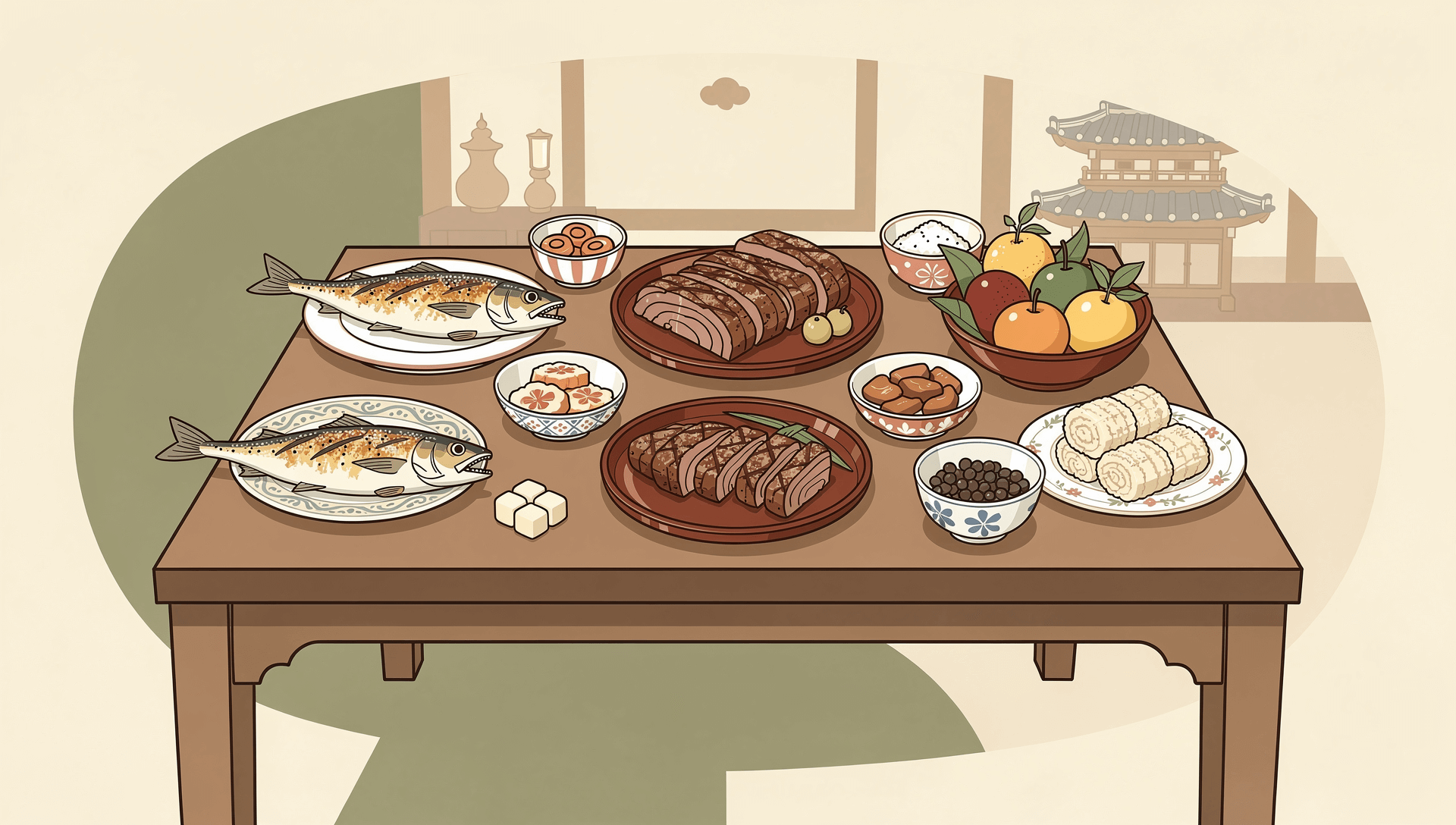 - 5열 (디저트): 과일과 과자를 두는 곳입니다. '조율이시' 순서로 대추, 밤, 배, 감(또는 사과) 순으로 놓고, '홍동백서'에 따라 붉은 과일은 동쪽, 흰 과일은 서쪽에 배치합니다.
