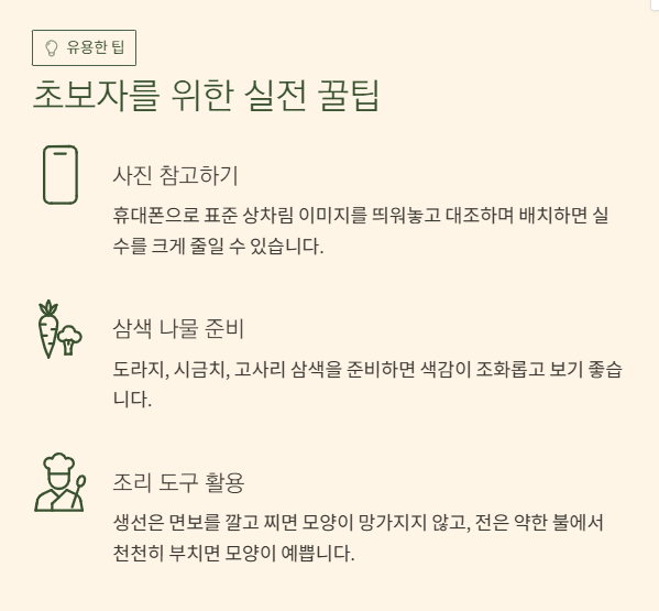 - 나물은 삼색(도라지, 시금치, 고사리)을 준비하면 색감이 조화롭고 보기 좋습니다.