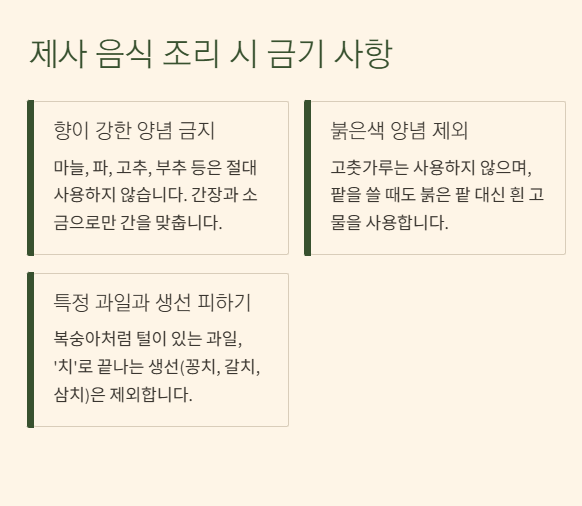 - 금기 사항: 파, 마늘, 고춧가루 사용 금지. 복숭아와 '치'자로 끝나는 생선 제외.