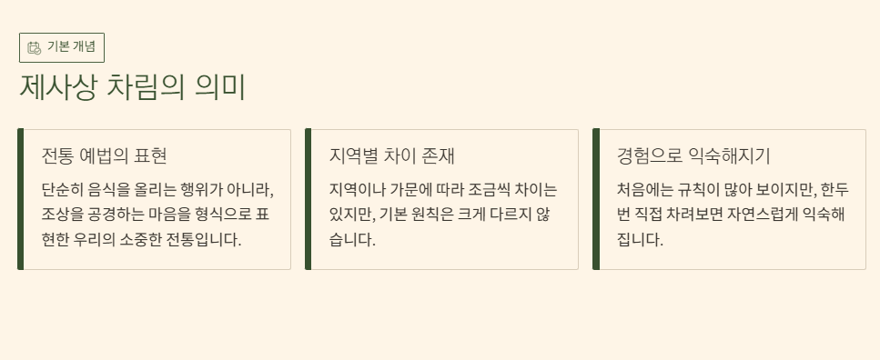 처음에는 규칙이 많아 보이지만, 몇 가지 큰 틀만 이해하면 훨씬 수월해졌습니다. 실제로 한두 번 직접 차려보니 자연스럽게 익숙해졌습니다.