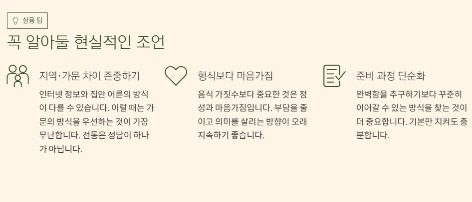 음식 가짓수보다 중요한 것은 정성과 마음가짐이라는 점을 직접 준비하면서 더 크게 느꼈습니다. 부담을 줄이고 의미를 살리는 방향이 오래 지속하기 좋았습니다.