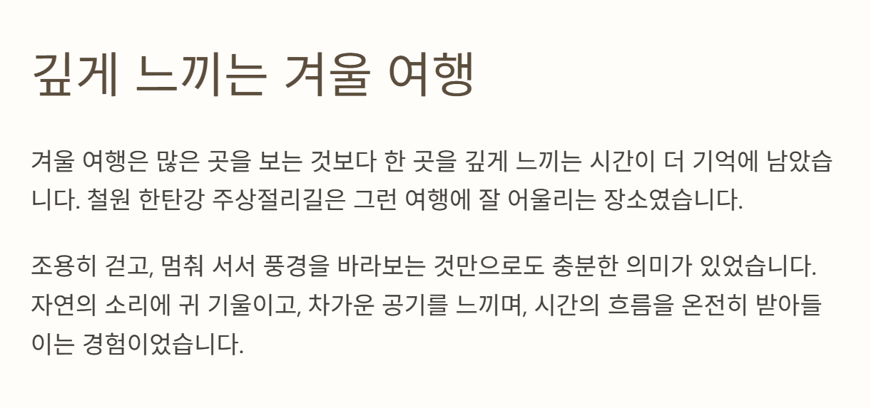 겨울 여행은 많은 곳을 보는 것보다 한 곳을 깊게 느끼는 시간이 더 기억에 남았습니다. 철원 한탄강 주상절리길은 그런 여행에 잘 어울리는 장소였습니다.