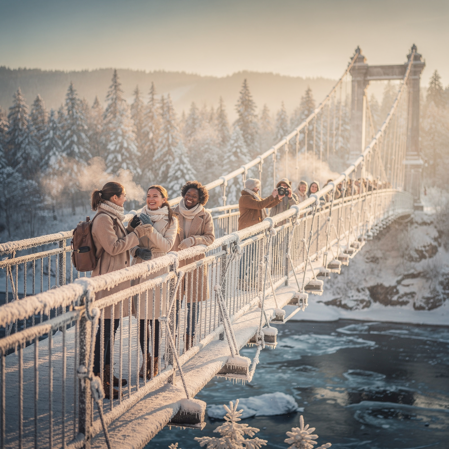 출렁다리 특성상 바람이 불면 체감 온도가 5도 이상 뚝 떨어집니다. 롱패딩은 기본이고, 모자가 달린 옷을 입어 귀를 꼭 보호하세요. 신발은 굽이 낮고 미끄럽지 않은 것으로 신어야 합니다. 다리 바닥이 격자 형태로 되어 있는 구간이 있어 뾰족한 굽은 위험할 수 있고, 얼어붙은 구간에서 미끄러질 우려가 있기 때문이죠.