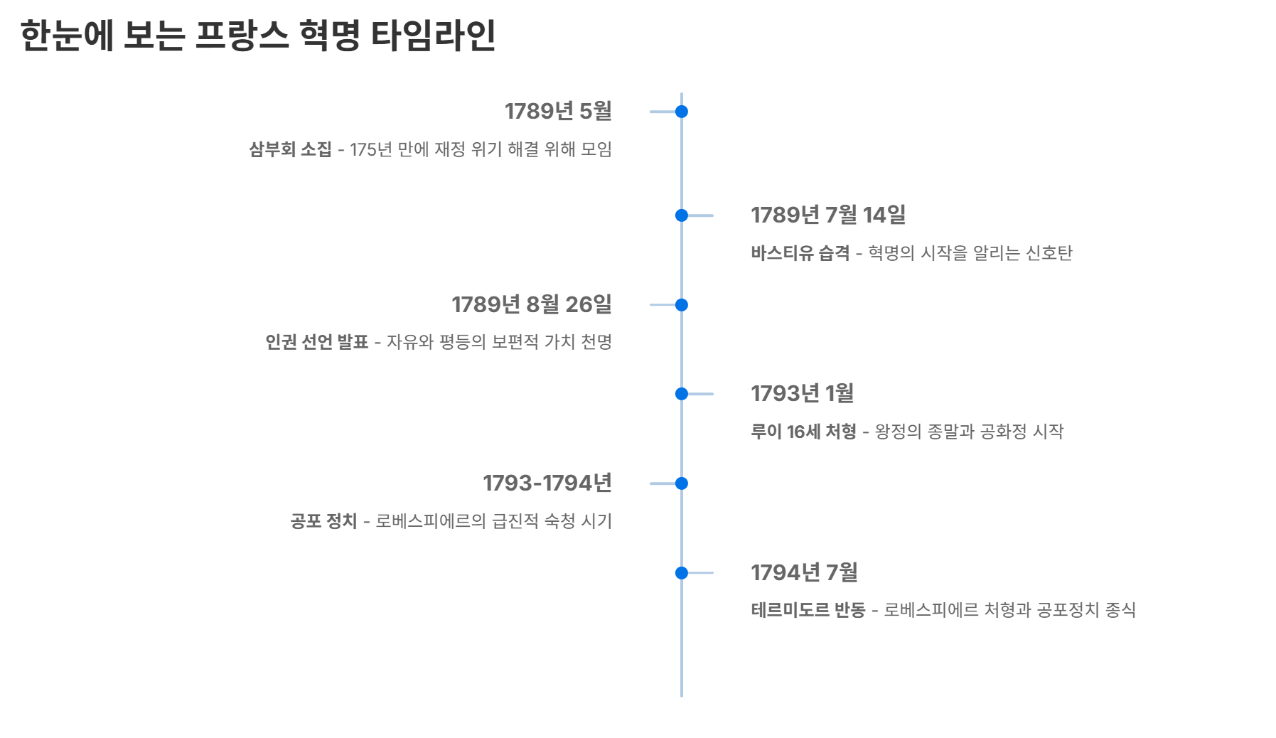 - 전개: 바스티유 습격으로 시작해 인권 선언을 거쳐 공포 정치까지 역동적으로 진행되었습니다.