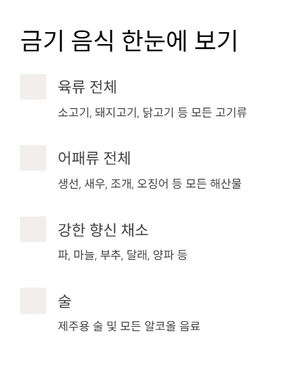 - 강한 향신 채소/오신채(五辛菜): 파, 마늘, 부추, 달래, 흥거(또는 양파를 포함해 해석하는 경우도 있음)처럼 강한 향은 피하는 쪽이 일반적이었습니다. 다만 이 부분은 절/스님 기준에 따라 달라질 수 있어 확인이 가장 정확했습니다.