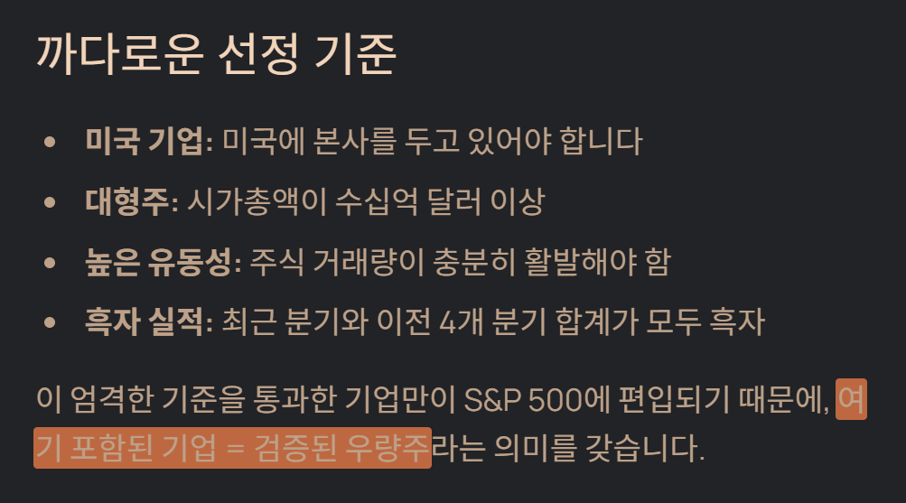 - 흑자 실적: 최근 분기 실적은 물론, 이전 4개 분기 실적의 합계가 흑자여야 합니다. 이 까다로운 기준을 통과해야 S&P 500에 편입될 수 있기 때문에, 여기에 포함된 기업은 곧 검증된 우량주라는 의미를 가집니다.