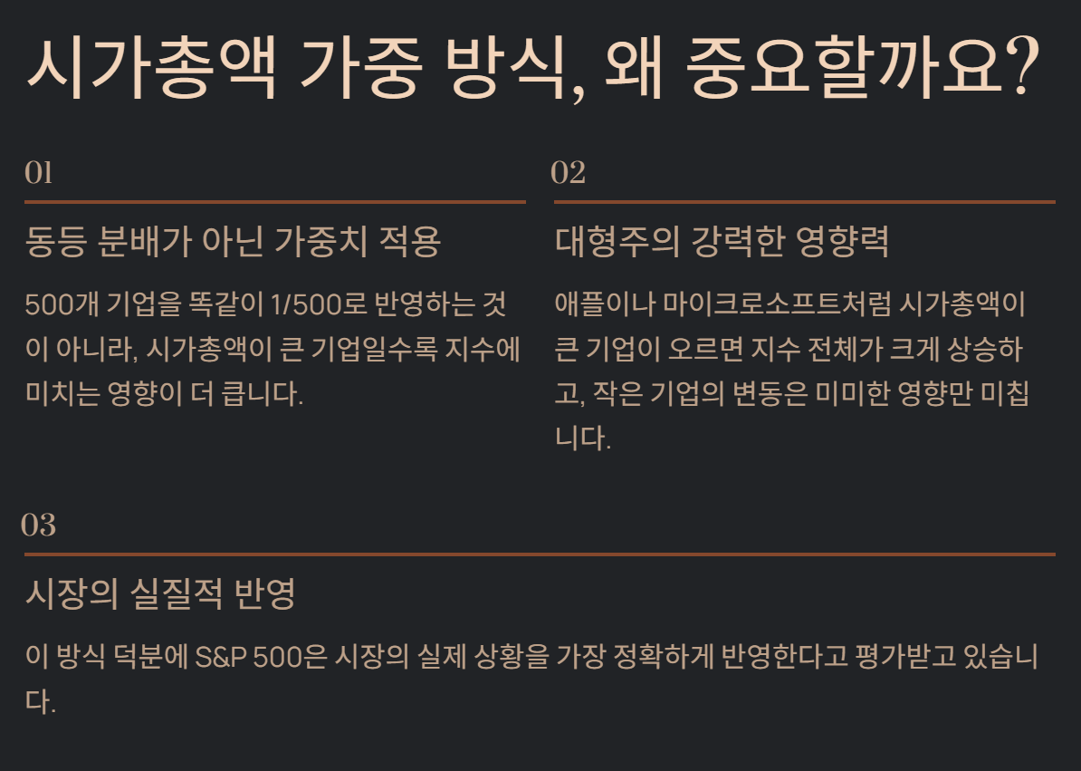 S&P 500 지수는 '시가총액 가중 방식'으로 산출됩니다. 쉽게 말해, 500개 기업을 똑같이 1/500로 나누어 반영하는 것이 아니라, 시가총액이 큰 기업일수록 지수에 미치는 영향이 더 크다는 뜻입니다.