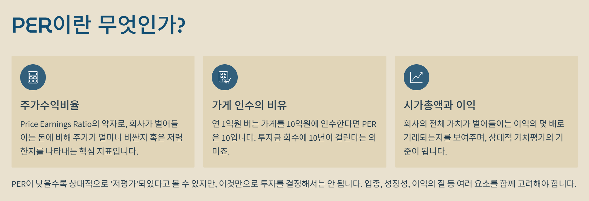 또 다른 관점으로는 내가 투자한 원금을 이 회사가 벌어들이는 이익으로 회수하는 데 몇 년이 걸리는지를 의미하기도 합니다. PER이 10이라면, 회사가 지금처럼 돈을 벌었을 때 내 투자금을 회수하는 데 10년이 걸린다는 뜻이죠. 그래서 수치가 낮을수록 상대적으로 '저평가'되었다고 말하곤 합니다.