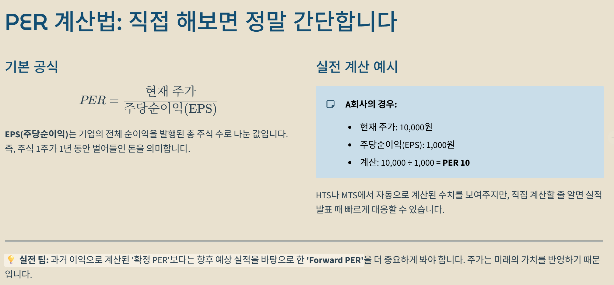 많은 분이 복잡한 수학 공식처럼 느끼시지만, 사실 원리는 아주 단순해요. HTS나 MTS에서 계산된 수치를 보여주지만, 직접 계산할 줄 알면 기업의 실적 발표 때 빠르게 대응할 수 있는 장점이 있더라고요.