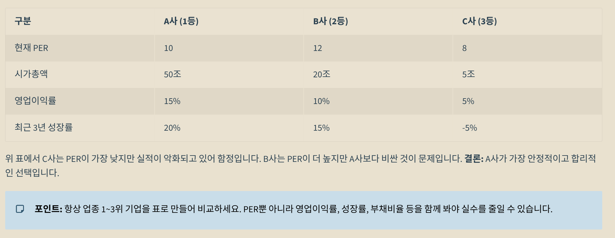 내가 사려는 주식의 PER이 12인데, 옆에 있는 1등 기업의 PER이 10이라면? 굳이 비싼 2등 주식을 살 이유는 없겠죠. 항상 경쟁사 2~3곳과 함께 표를 만들어 비교해 보는 것이 실수를 줄이는 방법입니다.