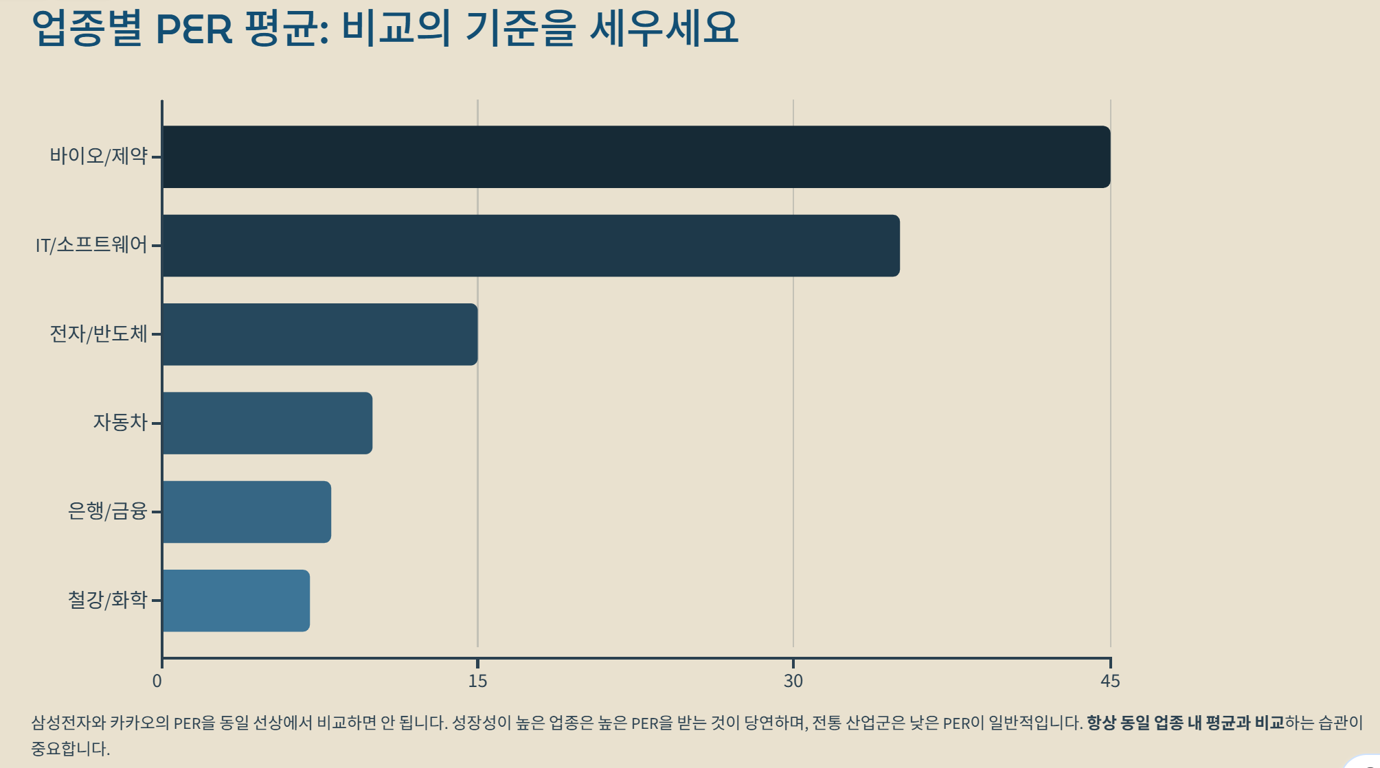 삼성전자와 같은 제조 기업과 카카오 같은 IT 성장주의 PER을 동일 선상에서 비교하면 안 됩니다. 보통 성장성이 높은 바이오나 IT 업종은 PER이 30~50을 훌쩍 넘기도 하고, 성장이 더딘 전통 산업군은 PER이 5~10 사이에서 노는 경우가 많아요. 따라서 동일 업종 내에서의 평균값과 비교하는 습관이 중요하더라고요.