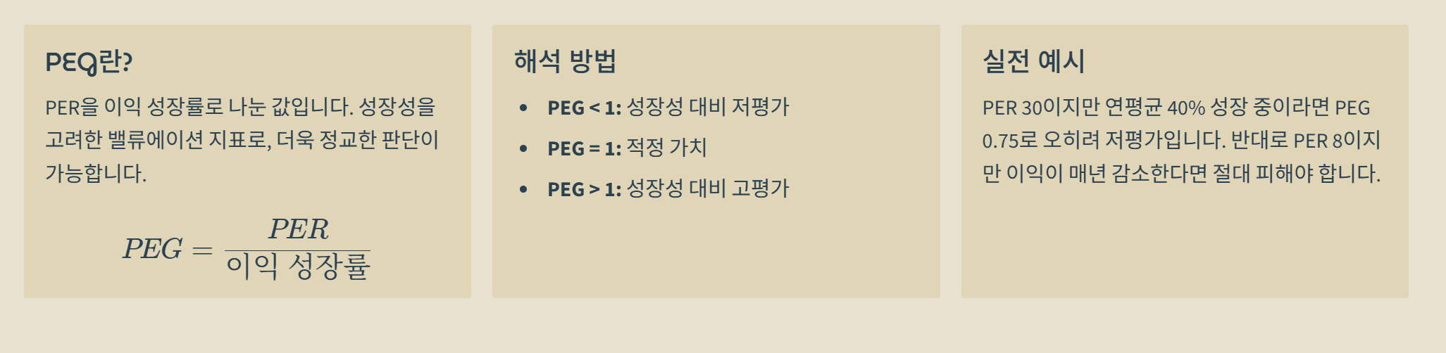 PER을 이익 성장률로 나눈 값을 PEG라고 하는데요. PER이 조금 높더라도 이익이 매년 엄청나게 성장하고 있다면 그 주식은 비싼 게 아닐 수도 있습니다. 반대로 PER은 낮은데 이익이 매년 줄어들고 있다면 절대 사면 안 되는 종목이죠.