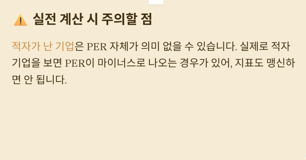 적자가 난 기업은 PER 자체가 의미 없을 수 있다. 실제로 적자 기업을 보면서 PER이 마이너스로 나오는 경우를 보고, 지표도 맹신하면 안 된다는 걸 체감했다.