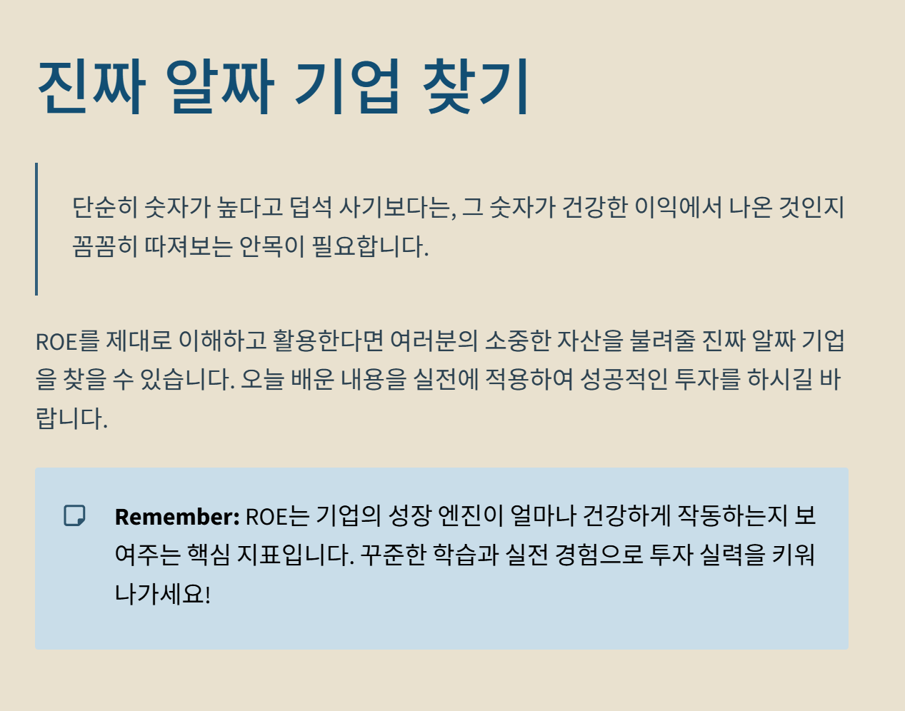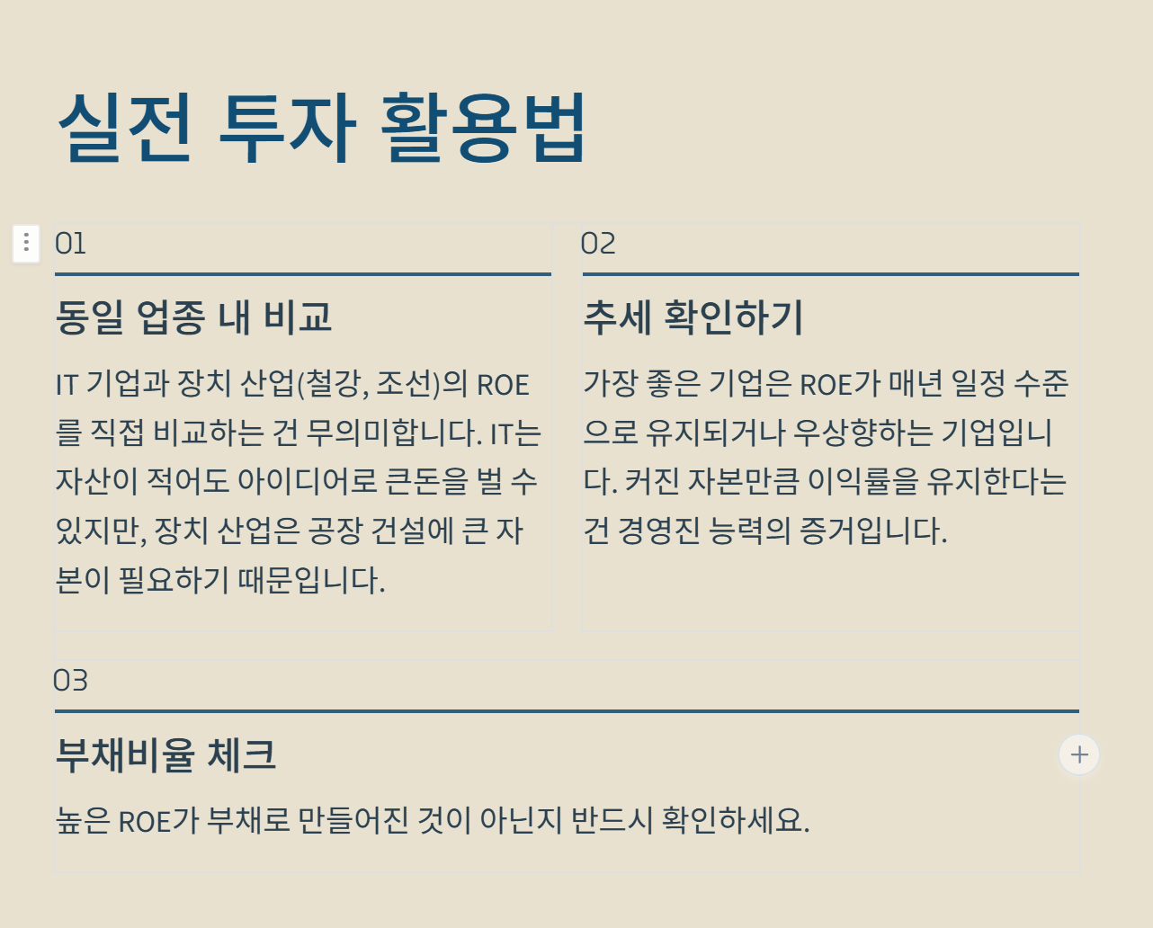 ROE를 제대로 이해했다면 아래 세 가지만은 꼭 기억하고 투자에 적용해 보세요.